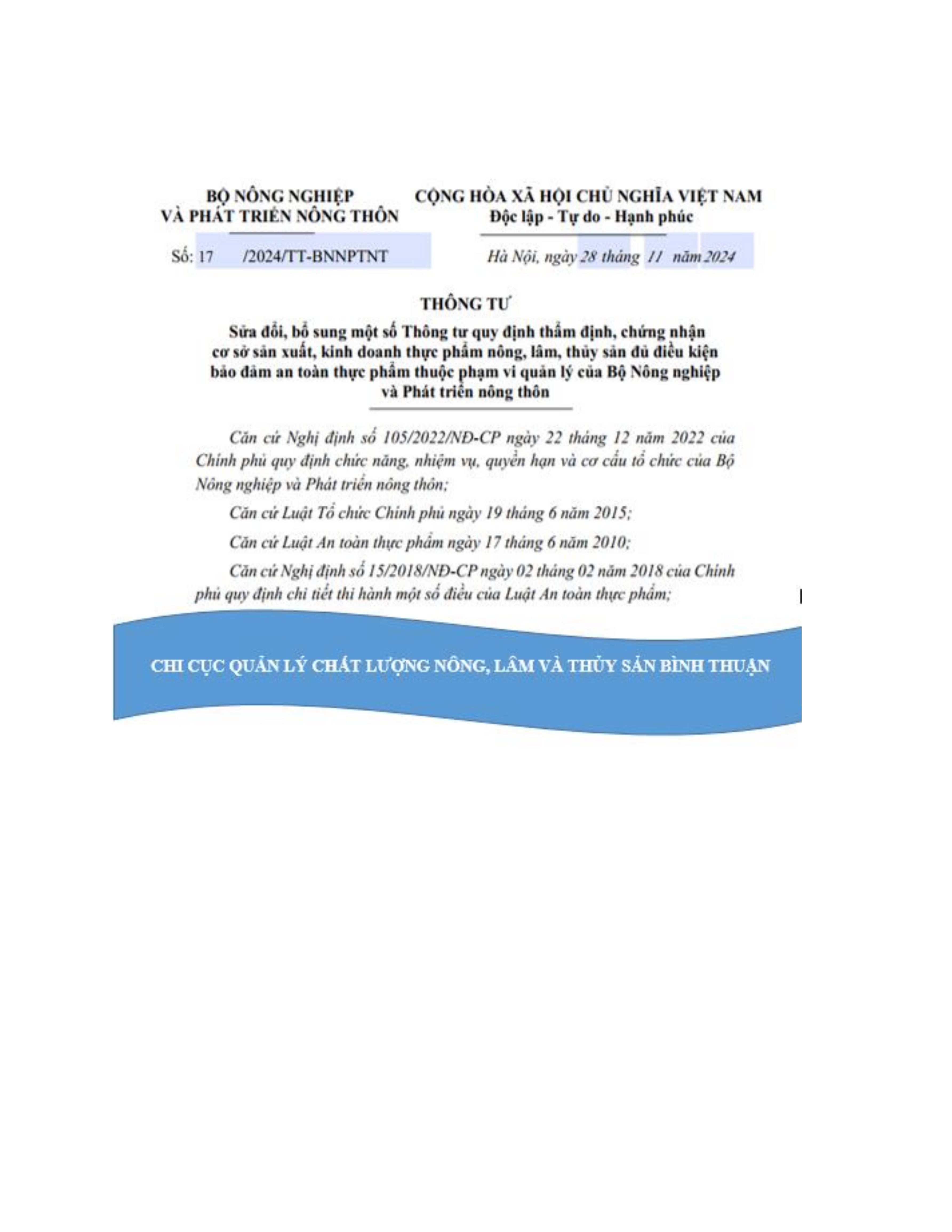Ngày 28/11/2024, Bộ Nông nghiệp và Phát triển nông thôn ban hành Thông tư số 17/2024/TT-BNNPTNT ngày 28/12/2024 về việc ...